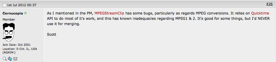 Forum member Cornucopia mentioned elsewhere on the Video Help forum that MPEGStreamClip has some bugs, "particularly as regards MPEG conversions. It relies on Quicktime API to do most of it's work, and this has known inadequacies regarding MPEG1 & 2. It's good for some things, but I'd NEVER use it for merging".