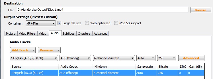My goal was to have 2 audio tracks for my encoded DVD rip. Audio Track #1 would satisfy AC3 surround, and Audio Track #2 would satisfy AAC surround (for IPAD/Apple TV devices) The source DVD contained a AC3 5.0 audio track.