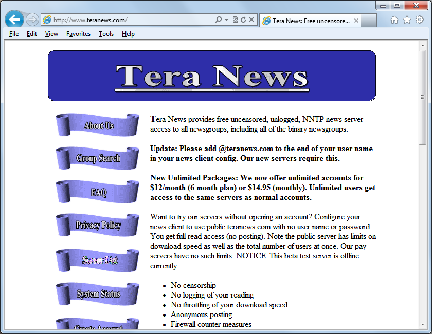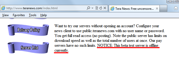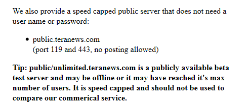 hehe - teranews free works, but has daily overall quotas and has always been iffy. the http://usenetstorm.com/ free daily service actually works for everyone and if you are only looking for mp3s or books would be all you'd ever need.