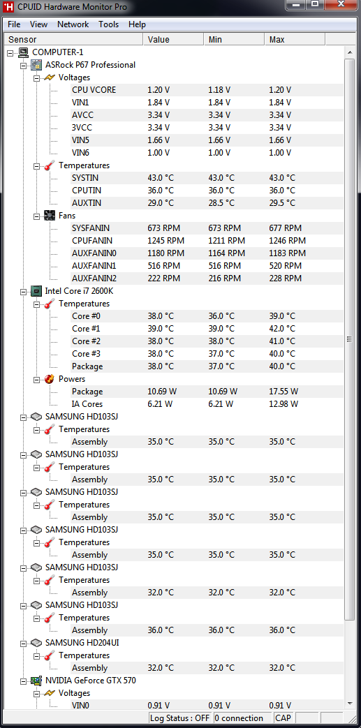 [EDIT: Whoops -- I have no idea why this snap is showing 0C for the cpu, a Xeon X3230 2.66. That makes no sense, so something must be out-of-whack. My strong hunch is that one of the other sensors is actually recording / reporting the cpu temp. There is definitely a cpu temp reported for the other rigs' snapshots.]