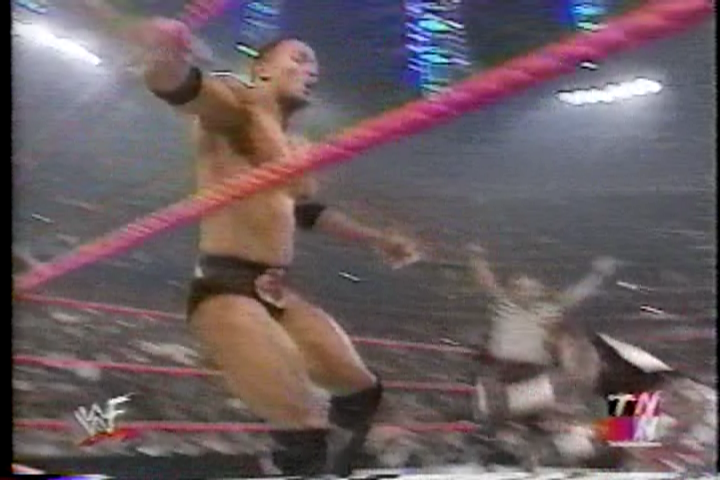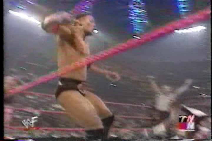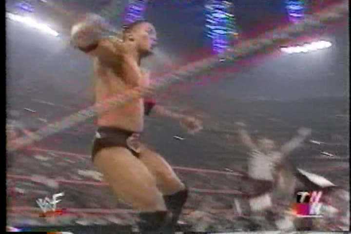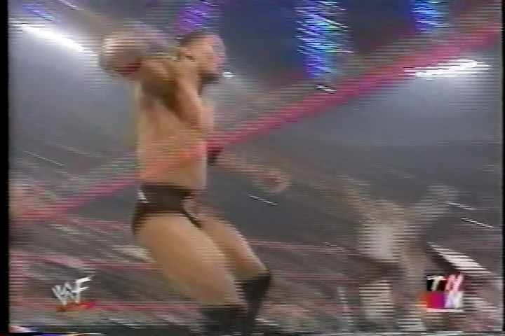 There are obvious macroblocks on the big guy's bare leg, near the knee, and one at chest level. Some less obvious blocks along the left border and along the length of the diagonal red rope. Clumped-up grainy stuff with chroma noise in dark areas and around the white lights on the right. Then there's color shift and bleed, mostly oversaturated red. Also, note the white ghost trails of the whitish figure on the right. Strong interlace combing and poor motion control. Most of this junk isn't "noise", it's low-bitrate artifacts and the usual tape playback problems.