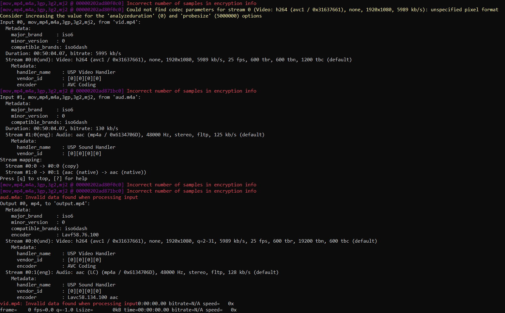 However, I don't seem to be able to mux the audio and video together. I get the following message: Incorrect number of samples in encryption info. Any ideas on what's wrong or what I'm missing? -