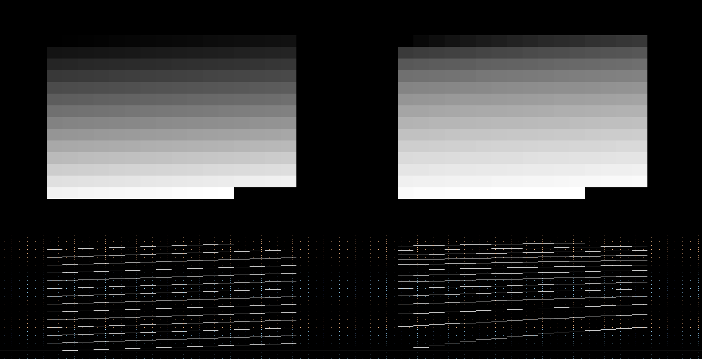 On the right is the result of ColorYUV(gamma_y=128, off_y=-12), a fairly extreme gamma change. As you can see the overall range of britnesses is the same. But the difference between consecutive dark shades has increased. At the lighter end of the spectrum you can see that the difference between consecutive shades is reduced. For example, the top line of the left graph shows 12 different intensities whereas the top line of the right graph shows only 7 different intensities. So the result of the increasing the gamma is to bring out detail in the darker areas at the expense of losing detail in the lighter areas.