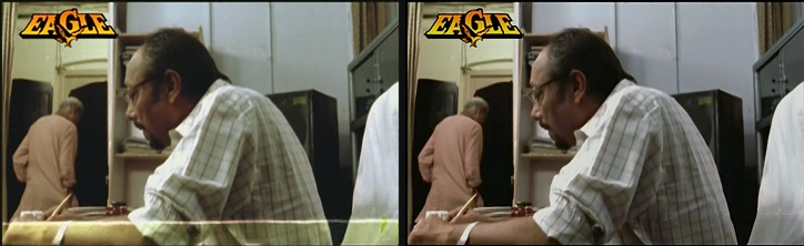 The deepest blacks are lowered form RGB 14 or 15 or so, down to RGB 8 to 11. A TV isn't going to reproduce darker than that with any accuracy. One downside is that the sharper cutoff in the region RGB 16 and up can be seen in the bottom image. Look at the guy on the right-hand side, and toward his left at the dark shadow on the wall. You should see more clearly how crushing/compression loses data that should form smoother gradations, but the result here is clumpy, banded noise. It will look worse when encoded. I'd have to get into the dither plugin and various deblockers, hoping to clean that up.
