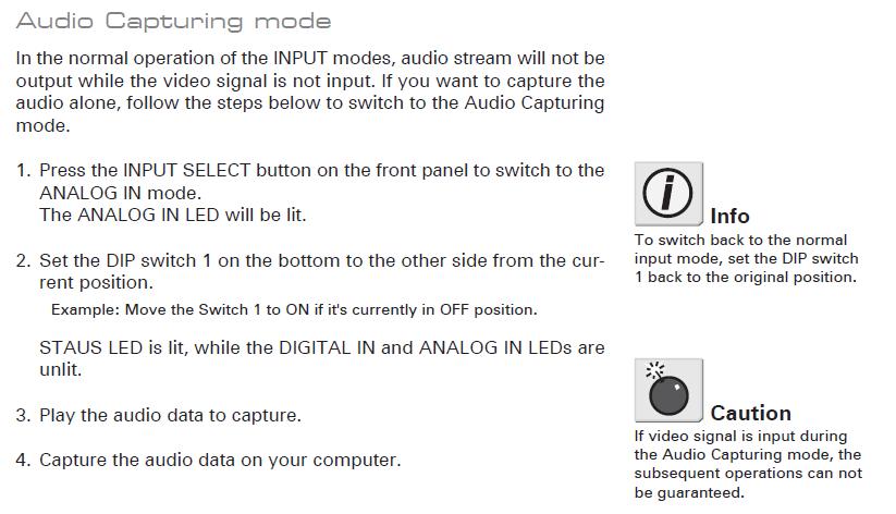 The ADVC-100 does, as ever, a splendid job of this of this... but only if it has a dummy video input connected to keep it awake.