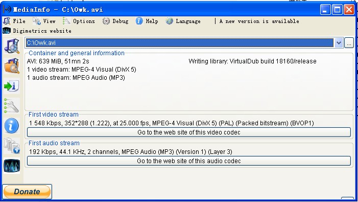 The file originally has a filename "owk.emule.td", I changed it to avi so it can be opened by MediaInfo. The two images are provided by opening the original file without modification (only filename).