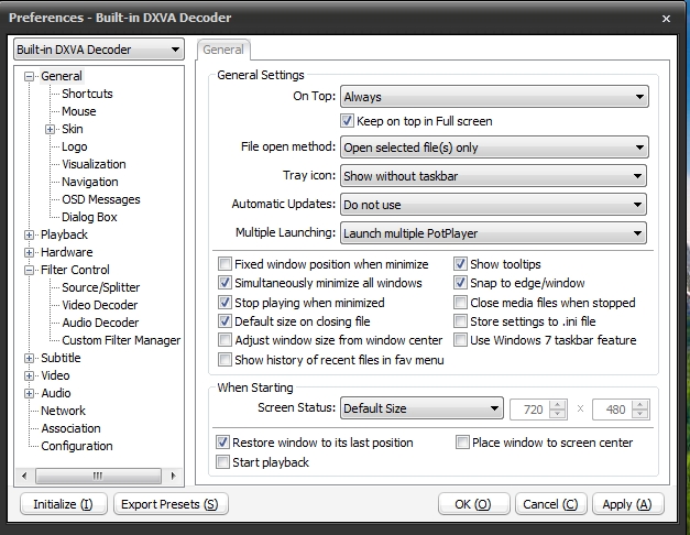 You don't have to select keep on top but I like mine to stay on top. The same for launch multiple players but I like to use more than one to compare quality settings sometimes. Snap to edge means it willsnap to top and side of screen if you more it close. I set When starting to default size also.