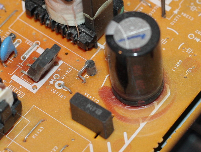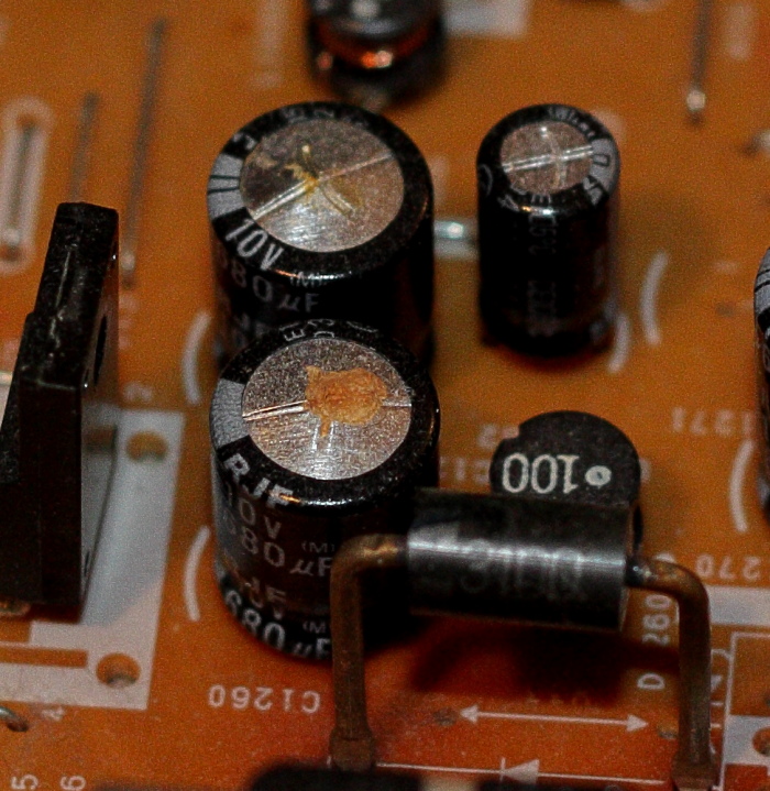 Those ones in the bottom pic are definitely the problem. I'd replace any other large electrolytic caps on the power supply board too. They've all been in there the same length of time and you don't really want to be doing the job again on the others in a few months time.