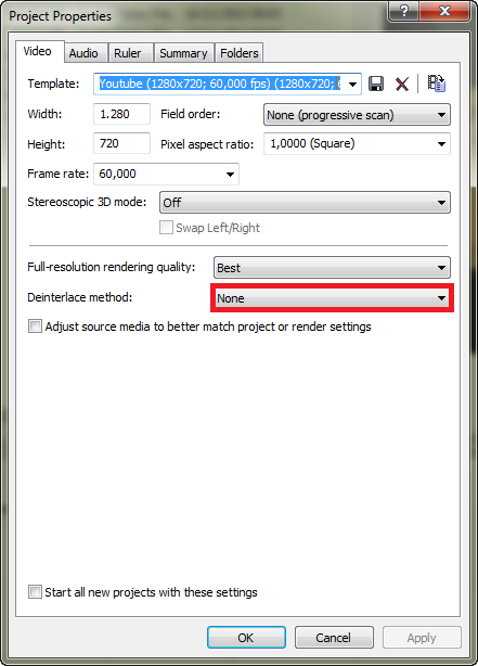 As for deinterlace method, it should be there for interlace content, when Vegas makes progressive output from interlace it needs little help how to deinterlace, isn't it working like that? (interlace to web for example)