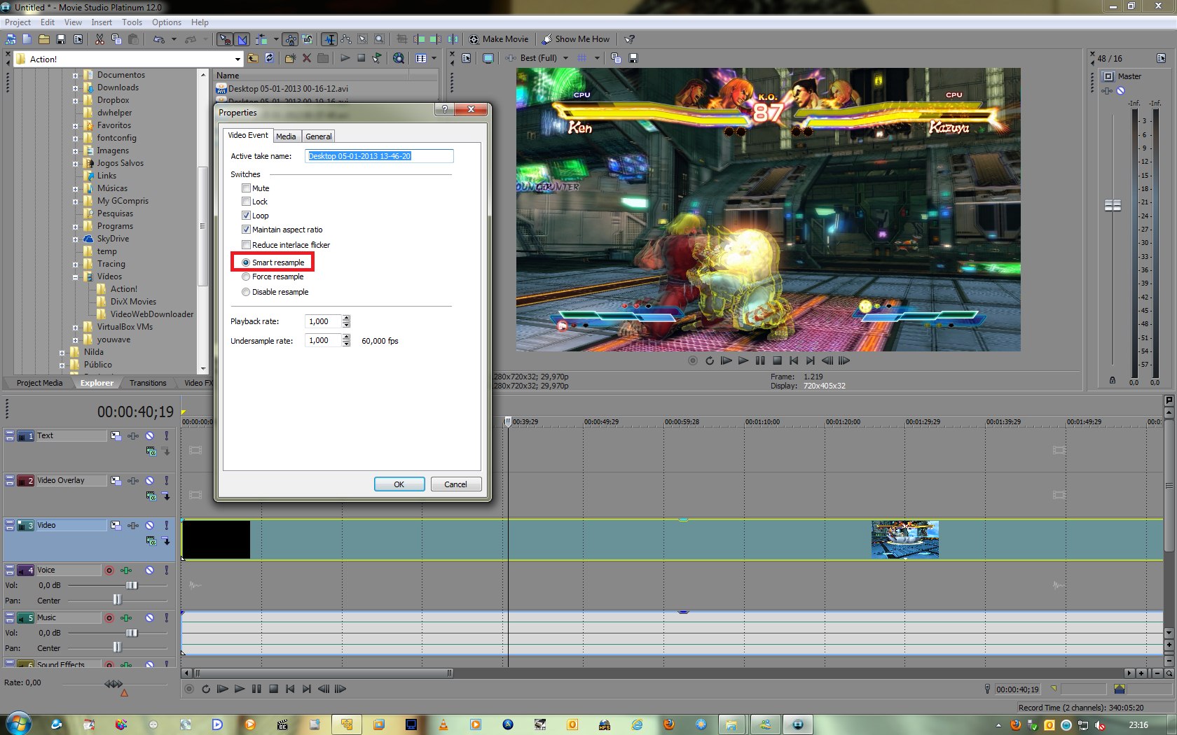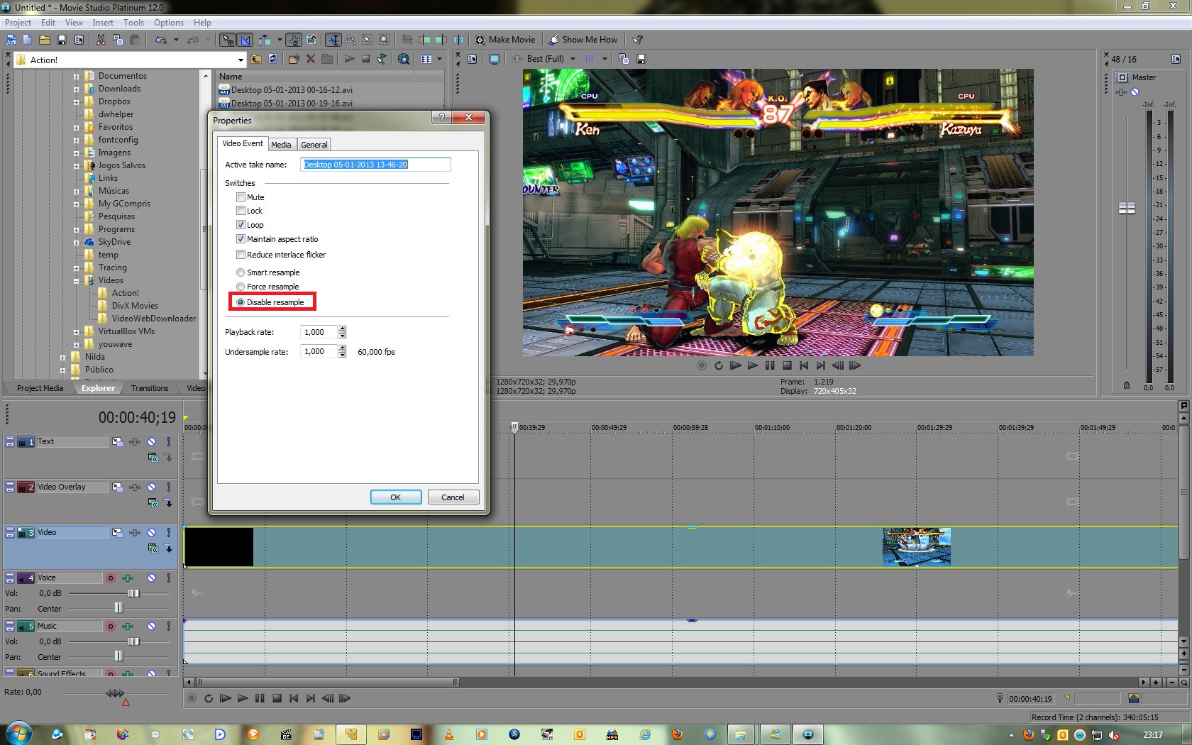 Instead of going to the 'Video Event' tab, though, I right-clicked each video piece on the editing timeline, hovered over 'Switches' and selected 'Disable resample' there. (Before, it was on 'Smart resample'.)