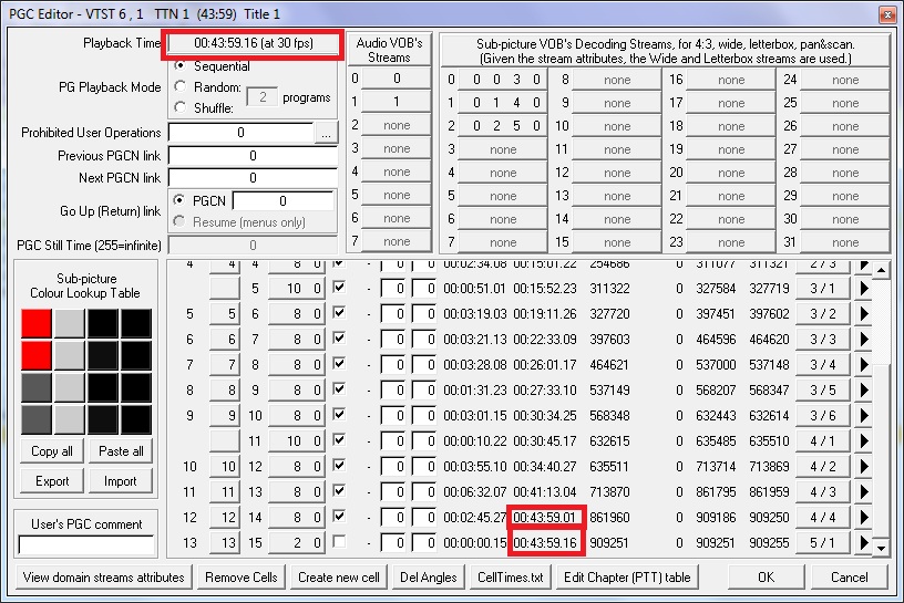 I told you it was very trivial, haha. I'm just going to leave it the way it is with the chapters then.You're worried about a hundredth of a second? Neither of those times is correct anyway as NTSC DVDs play at 29.97fps and PGCEdit doesn't use drop-frame timing to show the correct length. Nor do most DVD players.The original DVD has the Playback time of 00:43:59.16 (at 30 fps) and the reauthored DVD has the Playback time of 00:43:59.17 (at 30 fps).