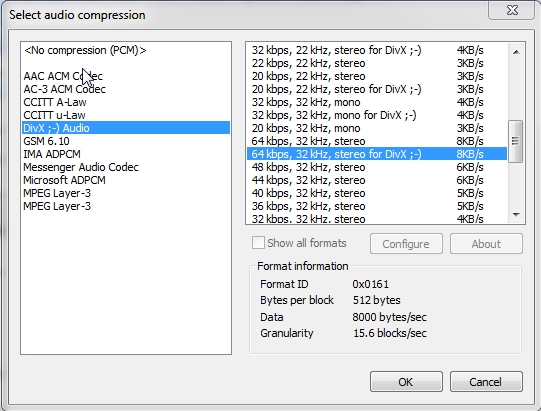 Audio (Divx 4.02 audio) I created an avi with WMV/WMA formatting. You have to choose the audio formats that have the Divx smiley on the right: