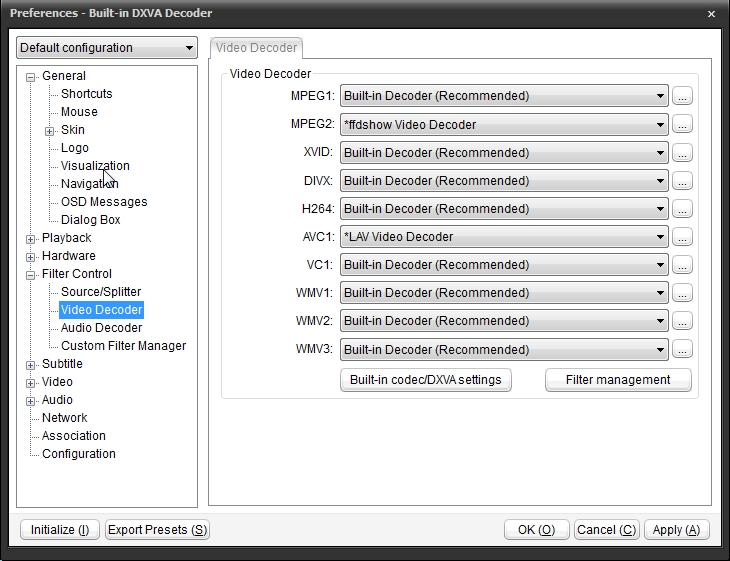 I verified this on mine and you'll notice I had MPEG2 set with FFdshow because I like thumbnails and originally I couldn't get thumbs with Potplayer FFMpeg decoder so I altered mine. -