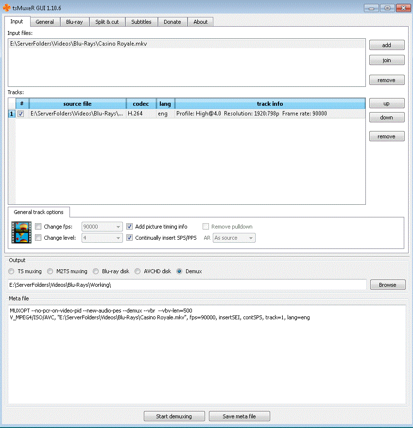 - Demux the handbrake encoded video stream with TSMuxer