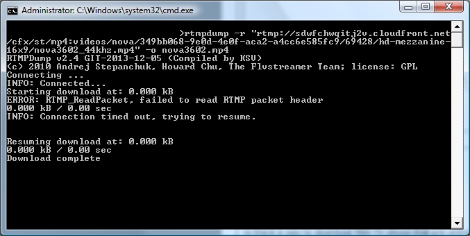 Code:rtmpdump -r "rtmp://sdwfchwqitj2v.cloudfront.net/cfx/st/" -a "cfx/st/" -f "WIN 16,0,0,235" -W "http://dun96pyxwe2yl.cloudfront.net/lib/jwplayer/jwplayer.flash.swf" -p "http://video.pbs.org/video/1051968443/" -y "mp4:videos/nova/349bb068-9e0d-4e0f-aca2-a4cc6e585fc9/69428/hd-mezzanine-16x9/nova3602_44khz.mp4" -o "nova3602_44khz.flv"