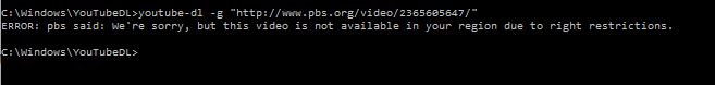 Code:youtube-dl --add-header "X-Forwarded-For:13.63.255.255" -g "http://www.pbs.org/video/2365889151/"