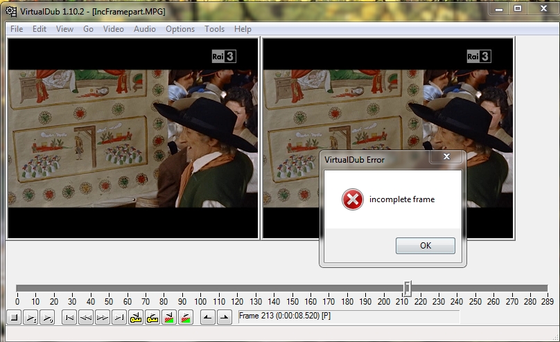 I re-opened the original video, but the simple playback of that point gives the above mentioned pop-up error ("Incomplete frame"). And if I advance some frames forward, I discover that it's not a single frame but about ten incomplete frames. After the last the playback continues correctly.