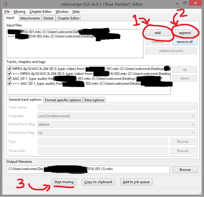 3. Append the 2 files [one which is ending at 0:01:20 (FILE C) + one which is starting at 0:05:45(FILE B)] using mkvmerge GUI