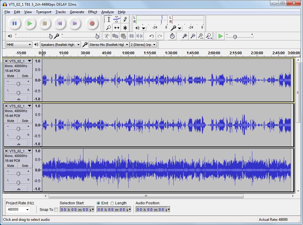 Here's an example of three channels from a commercial DVD with 5.1 audio: