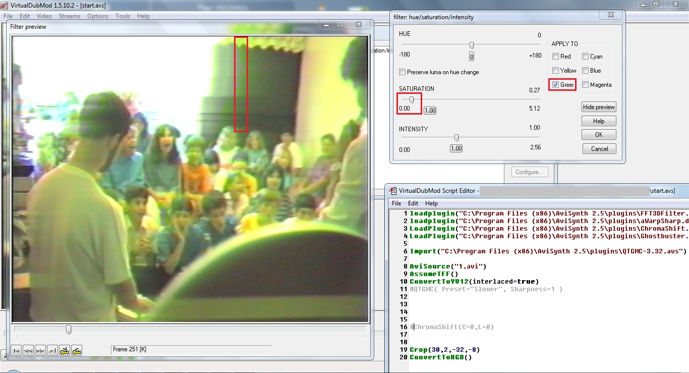 No, the hue/saturation/intensity(1.2) pluigin is not the worst plugin. Happens to be quite good. What's worse is the way you've ruined this avi clip. Nothing you can do with it after it's gone into RGB32.
