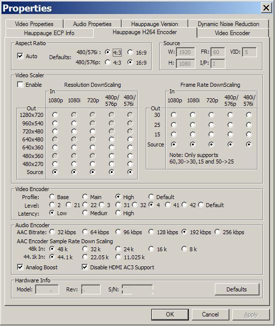 Sorry I don't have 1080p/60 right now. I think it will leave the rate unchanged ie 1080p/60 will downscale framesize to 720p/60 since there is also another option to down the rate to 30, 15 etc.. and you can leave it as "source" as default. One nice feature is that you can downscale the audio sample rate and bitrate too if you want a smaller file size. One bad thing is that unlike the 1212 you can't power off the video view while capturing. I'm using driver version 1.3.31041.0 which came with the download called 1.6 on the Hauppauge site I know there is 1 more update to the driver v1_3_31062 and might try that after tonight but don't want to risk messing it now I need to capt tonight now that it's working well enough.
