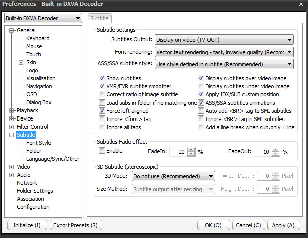 First of all, I love the program except for one thing. If I try to play SRT subtitles from a separate file, the colors are black with white border not white with black borders. All other type work fine. If there is a way to fix this no one has come up with it and I sure cannot find it. Other than that, love it! It plays AVISynth, plays a converting video WHILE it's converting to trial view the result, allows external codecs if you wish, and of course plays everything, just to mention a few...