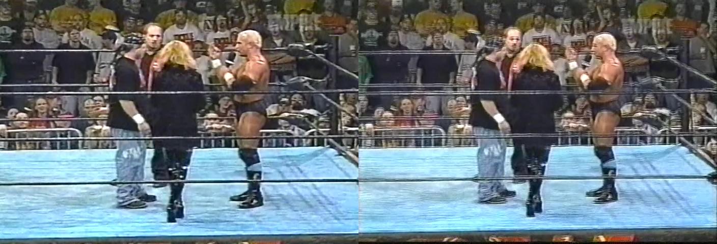 Code:setmtmode(5,9) Mpeg2Source("E:\2 = New\z = Encode\ECW Hardcore TV October 13 1998 Fixed.d2v", CPU=6) setmtmode(2) McTemporalDenoise(settings="medium", interlaced=true) AssumeTFF() QTGMC(Preset="Super Fast") RemoveSpots() AddGrainC(var=1.0,uvar=1.0) mdata = DePanEstimate(dxmax=0) Vinverse() DePanStabilize(last, data=mdata, initzoom=1.05, dxmax=0, dymax=4) SeparateFields() SelectEvery(4,0,3) Weave() Tweak(Hue=0, Sat=0.8, Bright=-0, Cont=1.0, Coring=False) Crop(0,0,-2,-8) # Bottom 8 pixels crop is required even if you don't have anything to crop to prevent the bottom of the picture moving up and down AddBorders(8,4,10,4) -