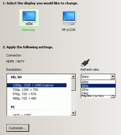 Back in the Nvida Control Panel, the same settings are available as presets for the TV, but the lower refresh rates are no longer labelled as "interlaced".