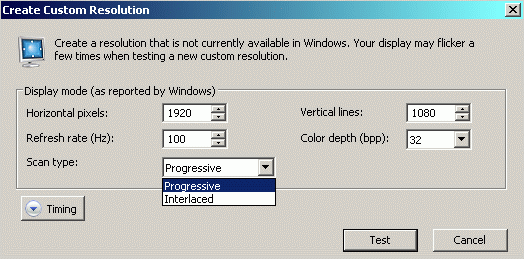 So from there I go into the customising section and try to set an interlaced output. The problem though, is it won't let me. The option is there, but regardless of the custom refresh rate/resolution for the TV or the CRT I choose, so far every time I've selected "interlaced" in the drop down menu, it immediately switches back to progressive. It kind of makes me inclined to assume my video card simply isn't capable of outputting interlaced video? I didn't want to mess around with manually changing timings, as I have no idea what I'm doing.