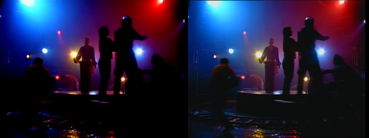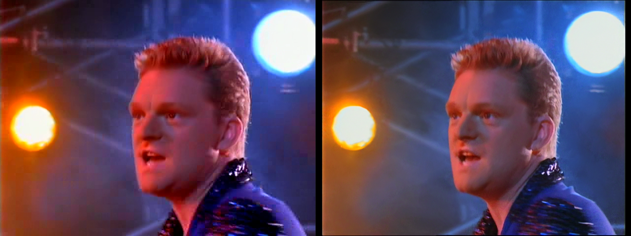 sample2.mpg on the left, the mkv attached below on the right: the mpg wasn't prepped for some annoying artifacts/problems before hitting it with NeatVideo, so the effects are crushed and mottled darks, loss of fine skin contours and detail, rough edges, mosquito noise, chroma bleed, oversharpened edges that look blurred, oversaturation (blooming) and posterization effects.