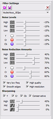 I took my NeatVideo noise sample from the blue right-hand side of frame 182. Here are the NV noise reduction settings I used, which are fairly typical in my projects. Some low-power cleanup was all that was needed after running the script: