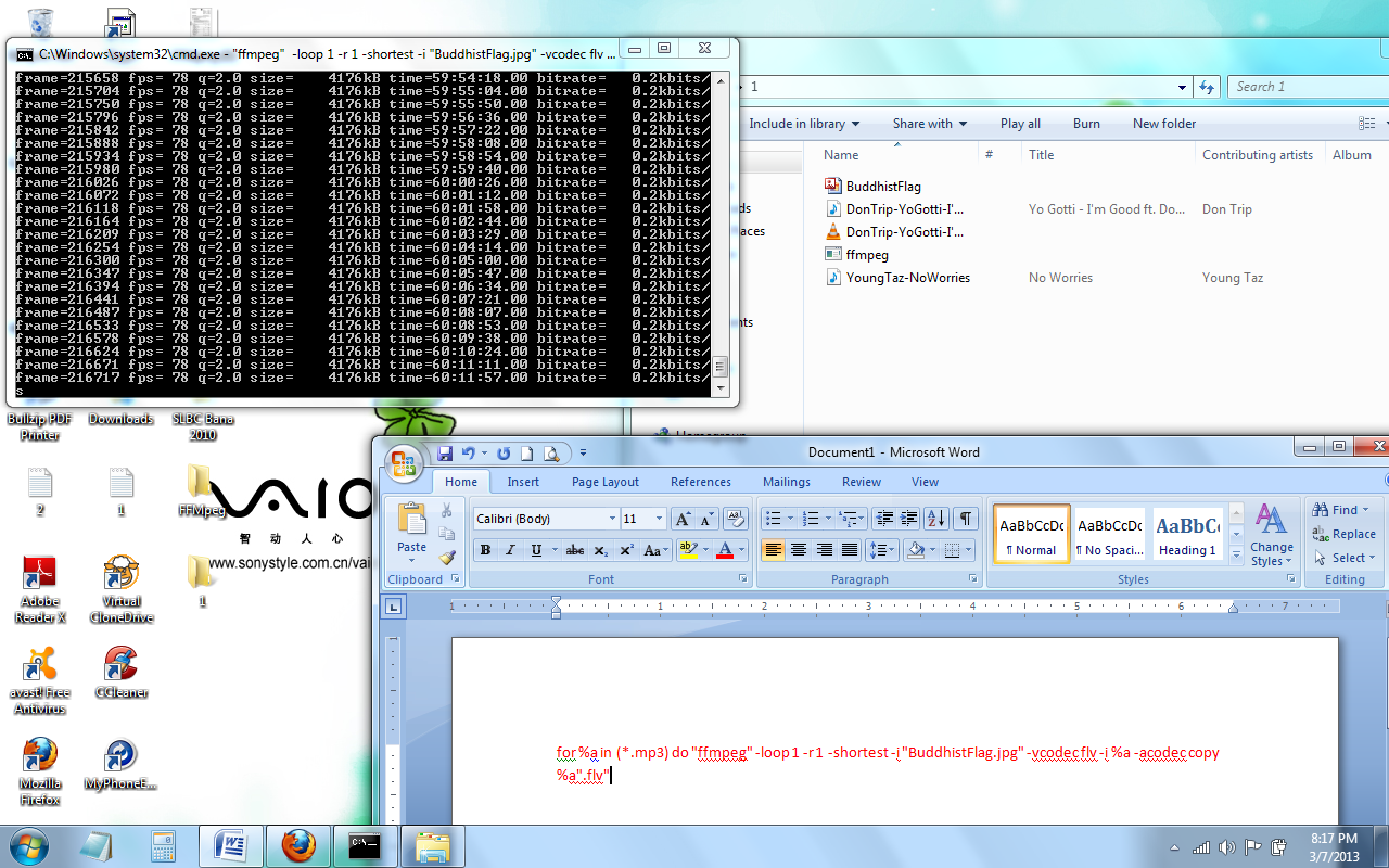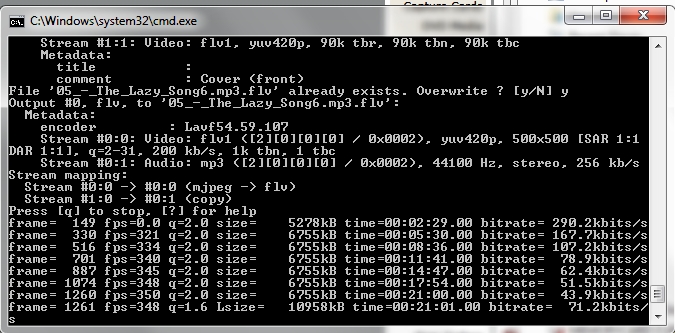 As you could see from the picture, a flv file for the first audio file in the folder was made pretty quickly by the FFMpeg, but the flv for the second audio file was not made even after more than 45 minutes from the start of the process and instead the FFMpeg kept running without any specific output as you can see from the command prompt window.