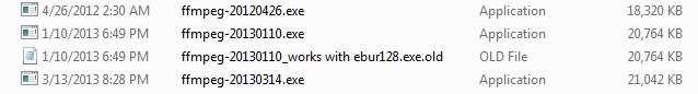 You might also notice my notation one one version that works with EBUR128 and it fails on the latest also. Guess the moral is FFMpeg is great but different versions seem to be VERY different in some uses. I'm noting all that work now and which ones so I can try all the failures on any new versions. I downloaded the 20120426 version at http://ffmpeg.zeranoe.com/builds/win32/static/ and there are a lot between there and 20130110 version I updated to but I'd start with the one that works and work up from there if you wish.
