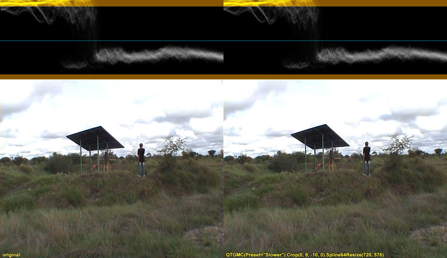 I hope you find it useful. Feel free to post any comments or improvements.Code:#------------------------------------------- # ShowFilterLumaEffect 1.1.0 # Visualises effect of specified filter on clip luma, with specific emphasis on clipping and/or banding # - displays the filtered clip and histogram alongside the original clip and histogram # # Useful when # # Testing whether specified filter or function would cause clipping or banding of current luma range # - this is useful when one intends to do initial filtering before normalising the luma range # Normalising clip luma range (provide normalising filter or function as input to the function for visualising results) # Dithering colour banding (provide dithering filter or function as input to the function for visualising results) # # ShowFilterLumaEffect(clip c, string filter) # # <c> input clip # <filter> filter expressed in OOP notation # # Usage # # # Testing whether specific filter would cause clipping or banding of current luma range # ShowFilterLumaEffect(OpenDMLSource("DV encode test source.avi"), """QTGMC(Preset="Slower").Crop(0, 8, -10, 0).Spline64Resize(720, 576)""") # # Visualising effect of normalising, dithering, etc. # ShowFilterLumaEffect(OpenDMLSource("DV encode test source.avi"), "levels(0, 1.0, 255, 2, 235, coring=false)") # # Requirements # # input clip must meet specified filter's criteria # filter parameter must be provided in OOP notation # # Version history # # 1.1.0 Francois Visagie # added identifying subtitles # # 1.0.0 Francois Visagie # function ShowFilterLumaEffect(clip c, string filter) { original = c filtered = Eval("original." + filter) orghisto = original.Histogram(mode="classic").Crop(original.Width(), 0, 0, 0).TurnLeft() orghisto = orghisto.Spline64Resize(original.Width(), orghisto.Height()) filhisto = filtered.Histogram(mode="classic").Crop(filtered.Width(), 0, 0, 0).TurnLeft() filhisto = filhisto.Spline64Resize(filtered.Width(), filhisto.Height()) return(StackHorizontal(StackVertical(orghisto, original.Subtitle("original", align=1)), StackVertical(filhisto, filtered.Subtitle(filter, align=1)))) }