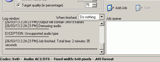 If that's not the problem, the log file is saved in the same folder as the output AVI. You can open it with notepad and copy it's contents to paste here, or upload it as an attachment to your post.
