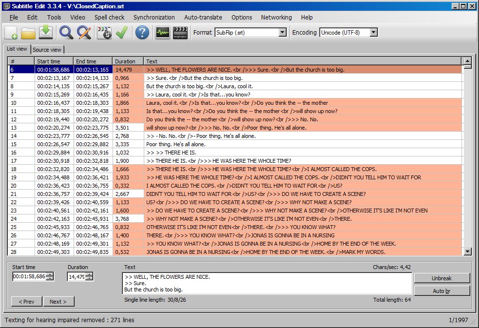 After the OCR you should have something like shown below. Here subtitle 1-5 is purely closed captions or hard-of-hearing contained in square brackets as well as subtitles 7-9 cotains partly CC. After removing text for the hearing impaired you should get something like shown in the next picture. And I forgot to mention at this point you should use Tools -> Start numbering from ... selecting 1. And you can always use Edit -> Undo.