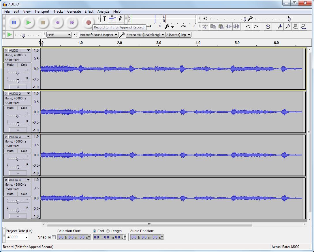 By the way, looking (and listening) in more detail, tracks 2, 3 and 4 are identical. Track 1 appears to be a normal "front" mono track, the other three just a phase delayed reverb channel. You don't really want to make that stereo. If anything, make track 1 into left and right front channels, track 2 into a rear channel(s), and delete tracks 3 and 4.Last edited by jagabo; 19th May 2013 at 18:12.