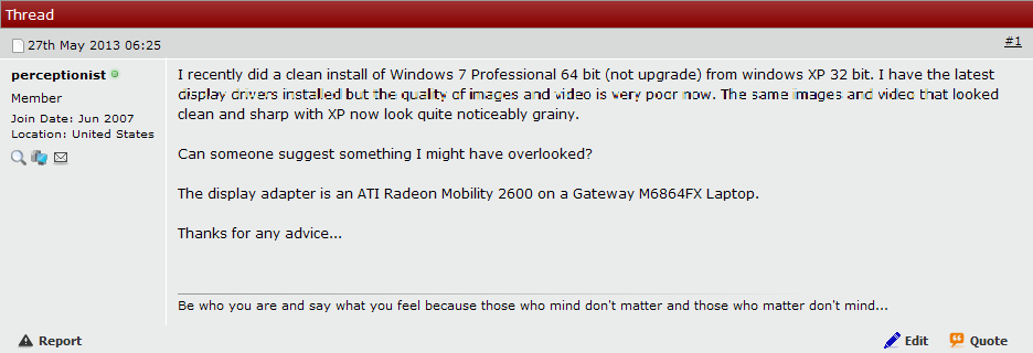 I recently did a clean install of Windows 7 Professional 64 bit (not upgrade) from windows XP 32 bit. I have the latest display drivers installed but the quality of images and video is very poor now. The same images and video that looked clean and sharp with XP now look quite noticeably grainy.