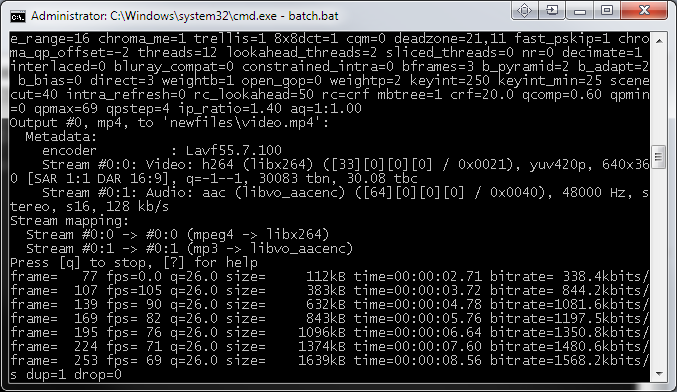 Code:for %%a in ("*.avi") do ffmpeg -i "%%a" -c:v libx264 -preset slow -crf 20 -c:a aac -b:a 128k "newfiles\%%~na.mp4" pause