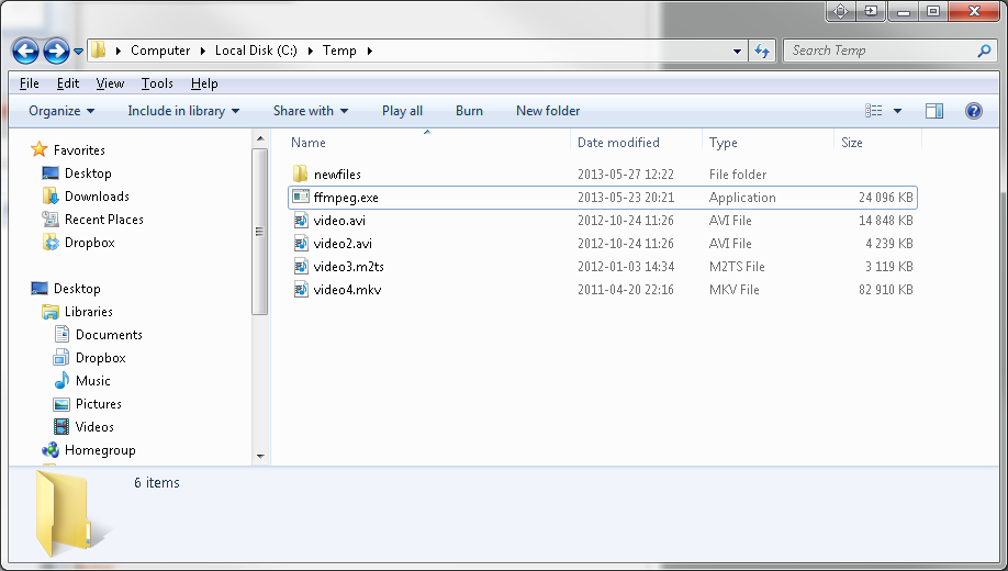 Put ffmpeg.exe in for example C:\ffmpeg and make the newfiles folder under C:\newfiles and you never have to move around the ffmpeg.exe and make new newfiles folder all the time. You just make the batch.bat file in the video folder.