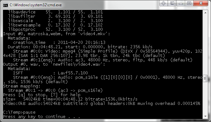 and this batchfileCode:ffmpeg -i video.mp4 -vn -acodec copy audio.m4a