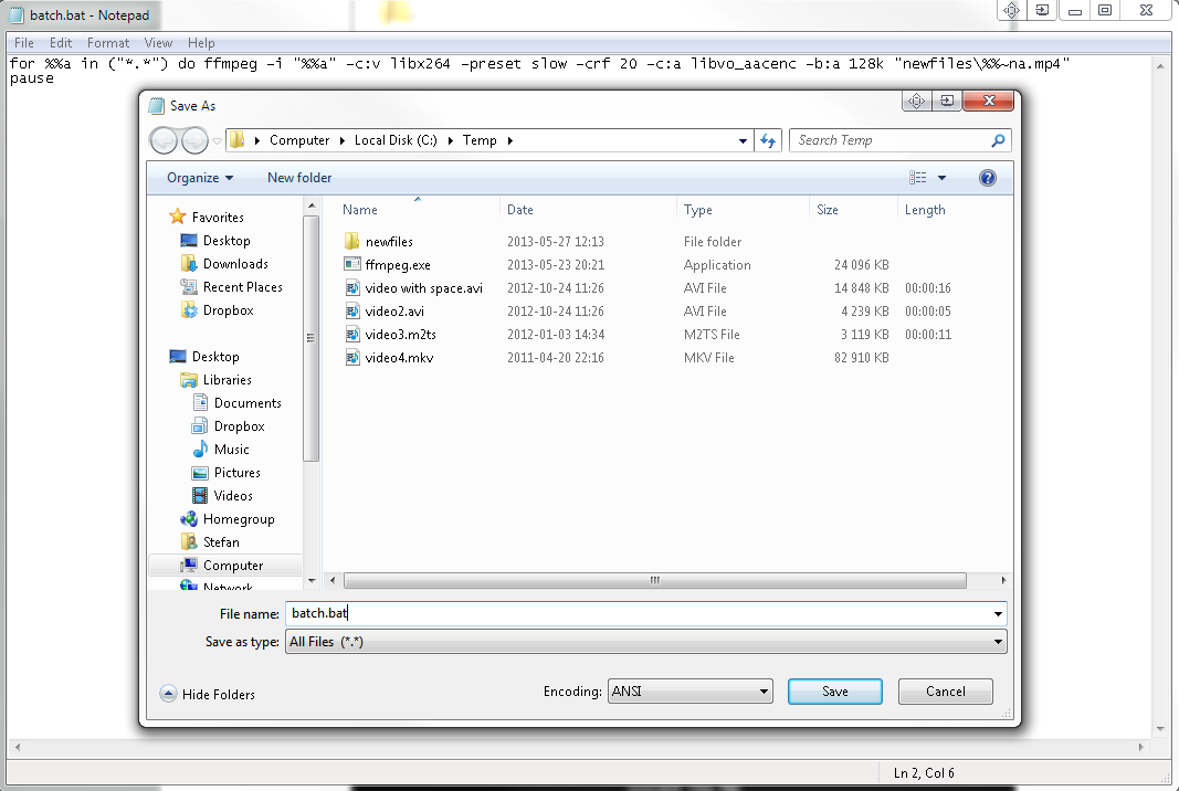 Now save it, File->Save as, change to All files under Save as type and save it as batch.bat.Code:for %%a in ("*.*") do ffmpeg -i "%%a" -c:v libx264 -preset slow -crf 20 -c:a libvo_aacenc -b:a 128k "newfiles\%%~na.mp4" pause