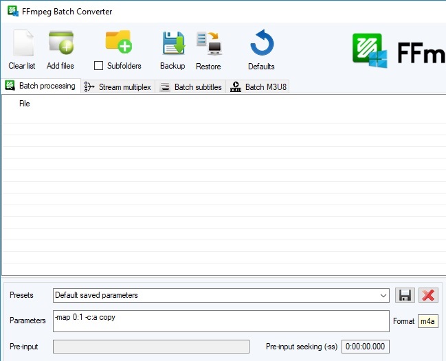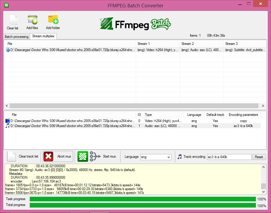 In your case, if your files just cotain one video and audio track, you can simply use in the main tab the next configuration:
