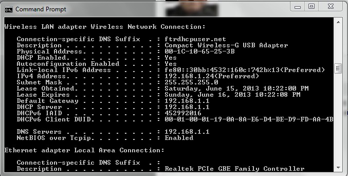 Just a quick tidbit ... You might also type 'IPconfig /all' from the cmd window and see what your main network port says and if you have nameserver, etc. Should look something like this: