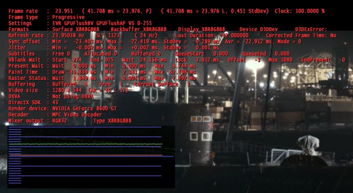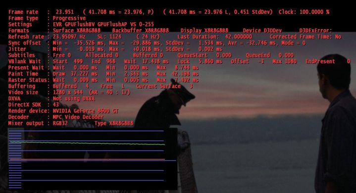 If these mean more to you than they do to me, below are a couple of screenshots using a refresh rate of 24Hz (real refresh rate 23.951) while playing a 23.976fps video. The first is without ReClock doing it's thing, the second with it.