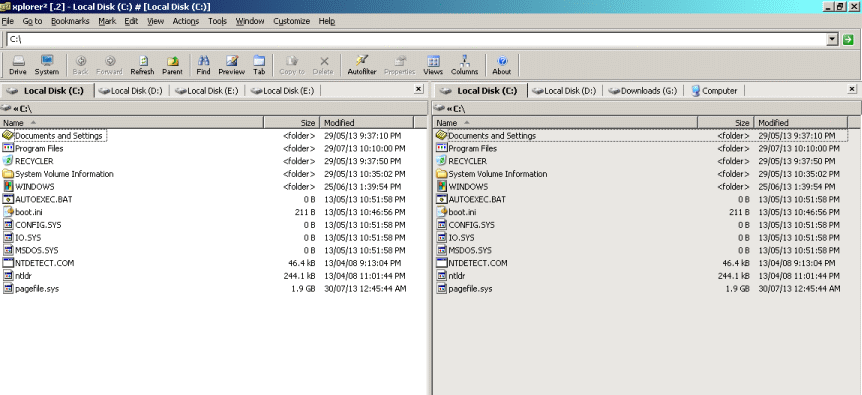I don't know about the "look like XP" part, and I use XP myself, but I think it's pretty hard to go past xplorer2. Even the free version is a big step up from Windows Explorer. It's dual paned, and each pane can have tabs like a browser. You can also set it to open to the last state when you close it, or set it to open in a particular state. I do the latter. It has the same folder tree pane as Windows Explorer but I generally leave it disabled to save screen real estate. I couldn't go back to using a tabless Windows Explorer any more than I could use a tabless Internet Explorer. When I first open xplorer2, it looks something like this for me: