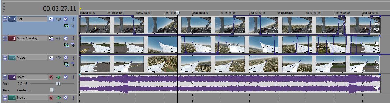 This is what my timeline looks like in VMS and as you can see to accomplish what I wanted in the first place and the main reason for trying VMS out I have inserted a composite level envelope for all 3 video tracks to be able to alternate between them during replay following the tip on this I found here -> http://www.youtube.com/watch?v=I1VkY6v3Ll4
