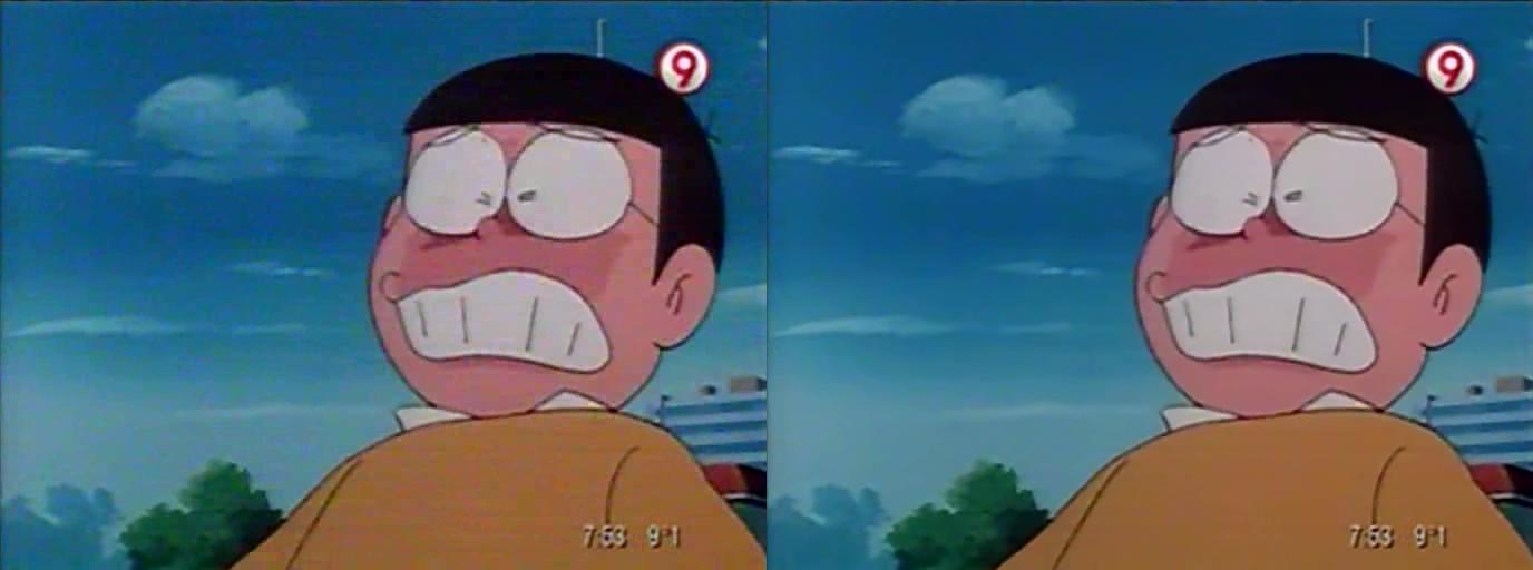 6. Try the VHS filter in VirtualDub. Or CNR2() in AviSynth. Or even McTemporalDenoise() if you can stand how slow it is. But a poorly deinterlaced Xvid encode of a low bitrate MPG file of an NTSC/PAL conversion of a VHS tape is a bad starting point. Before and after McTemporalDenoise():