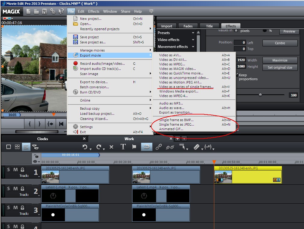 Yes they seem to work ok on your screenshot . Was anything applied ? (any effects besides position and scaling) , or did you just drop it on the timeline ?Well, if I'm still following correctly, both those formats you've most recently sent happily do cut the mustard, yes? If so, I'm looking forward to the full video. Preferably in black on white; now that I've seen it the black clock face while admirably readable does looks a bit grim, don't you think?You just have to find a compatible format that MEP understands - so post the mediainfo report of one that works, and I can export it in that format , or someone can make a better, more customized fancy clock. I suspect uncompressed AVI will work