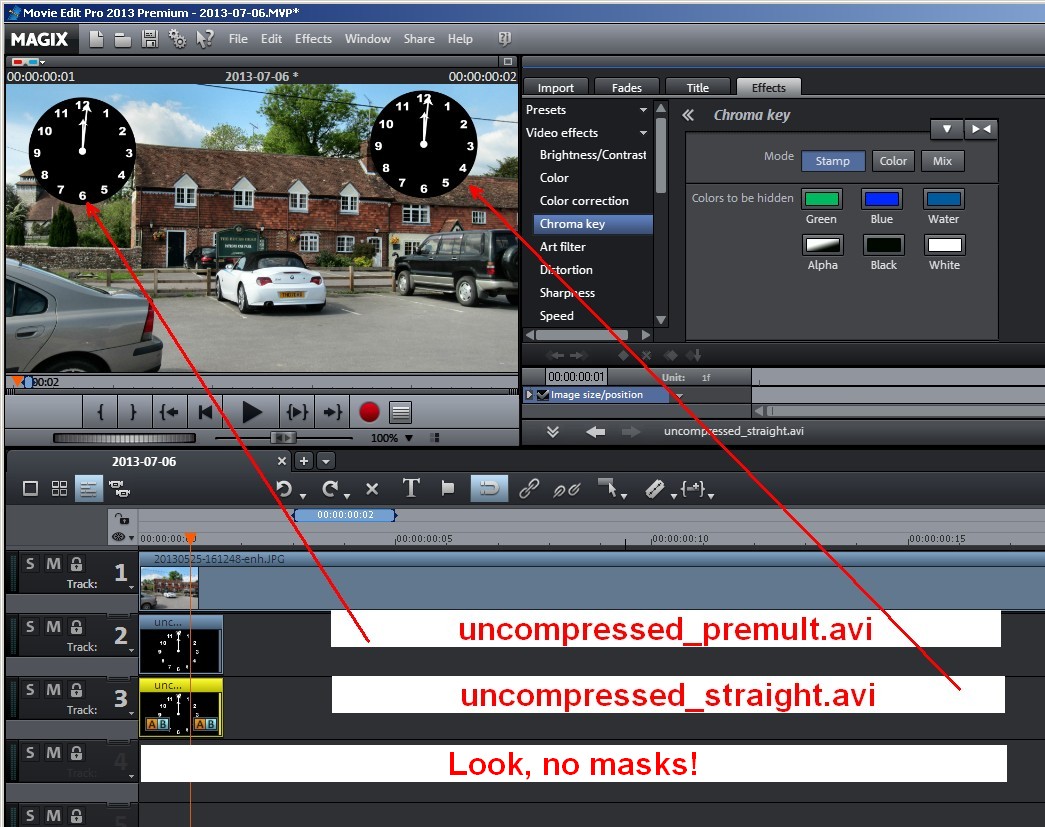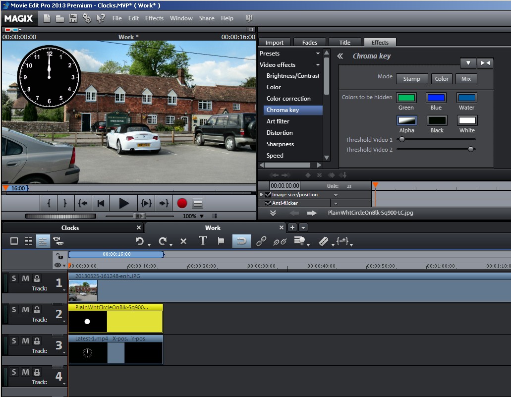 On which tracks in which editor did you place your background, clock and mask? How have you avoided black hand and numerals becoming partially transparent as in my case? What chroma setting was appled to the mask? Anything done to the original clock?